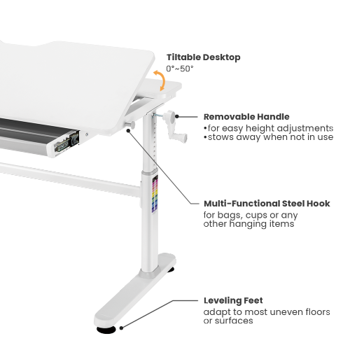 ●Tiltable Desktop: provides better angle for writing, reading and drawing