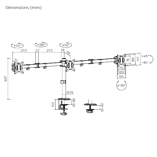 With a durable steel structure, the LDT66-C034 provides stable support for three 17” to 27” monitors up to 7kg(15.4lbs) per arm. Flexible design for ample adjustment and viewing angles, adjustable for either portrait or landscape orientation. Grommet and clamp mounting options included for installation on most any work surface. A detachable VESA plate for user-friendly installation. Cable clips included for an organized and clutter-free workplace.