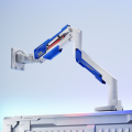 This monitor arm stands out with a futuristic, industrial design, featuring sharp lines and bold color contrasts. The exposed gas spring mechanism adds a high-tech vibe. Its sleek form integrates seamlessly into modern spaces, offering a perfect blend of functionality and visual impact. Designed for effortless adjustability, it ensures precision and style in any setup.