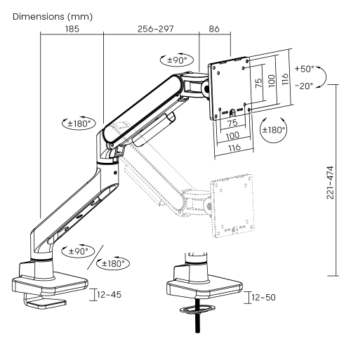 Suggested Desktop Thickness: | Clamp:12~45mm Grommet:12~50mm (Clamp:0.47"~1.8" Grommet:0.47"~2") |