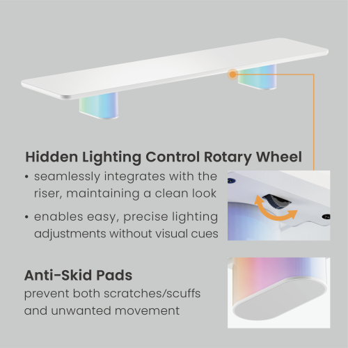 The monitor riser with illuminated legs seamlessly blends contemporary style with practical functionality. With a hidden lighting control wheel, it offers customizable lighting with three modes: 6-color rainbow gradient mode, 7-color static mode, and 6-color breathing mode. This riser not only raises the monitor for ergonomic comfort, but also enhances the space with adjustable, dynamic lighting. The minimalist design provides a sophisticated touch while maintaining an uncluttered, modern look.