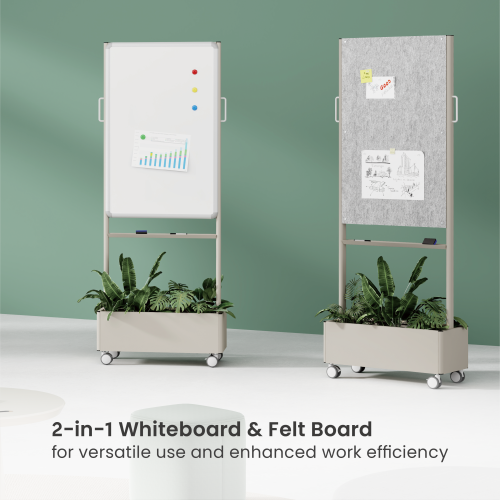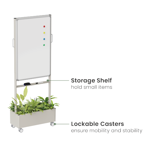 Floor Planter with Whiteboard is perfect to elevate the meeting spaces. This versatile solution features smooth-rolling casters for effortless mobility and a double-sided whiteboard & felt board for ample display area. Ideal for dynamic environments, it combines a functional plant display with a practical writing surface, enhancing both aesthetics and productivity. Elevate your market offerings with this sleek, space-efficient solution that meets the evolving needs of today’s business spaces.