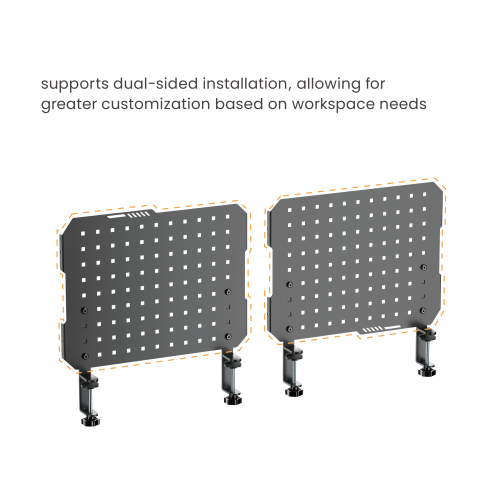 The Dual Pegboard Set provides a modern and efficient solution for organizing any workspace. Precision engineered, this dual board system features evenly spaced perforations for versatile accessory placement and expanded storage capacity. Its durable construction and minimalist design create a perfect blend of organization and aesthetics that seamlessly enhances any space. The included clamp with protective pads securely attaches to the table, providing excellent stability while preventing surface damage.