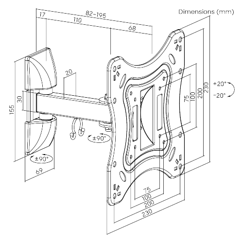 The new model LPA51-221 is designed to fit any 23"-42" Flat Panel TV up to 20kg/44lbs. Simple construction allow easy installation. Full motion allows maximum flexibility — extend, tilt and swivel your TV up to 195mm from the wall in every direction for easy viewing from any seat in a room. Cable clips included keep cables organized. VESA compatible with 75x75, 100x100, 200x100, 200x200.