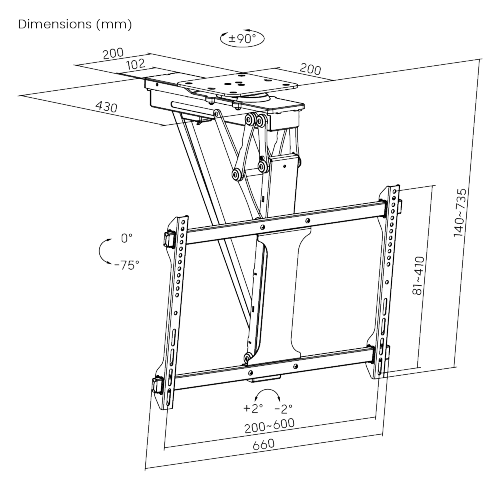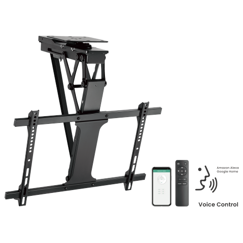 Ceiling Mounts are usually picked by the customers who prefer their TV folded or space saving for the room. Now, via Remote/Tuya App/Voice Control, the PLB-M0546S mounts can swivel up to 180° for multiple viewing angles. Quality motor holds TVs up to 75" (35kg/77lbs) and provides automatic flip up and down function with the press of a button. A balanced mechanism prevents any ceiling vibrations when the TV is in motion. Collision avoidance system stops swiveling the TV when there are any obstacles. Keyhole pattern allows for easy installation and height-adjustment. This mount can be installed on cement or other solid surfaces. Perfect choice for public or home TV viewing installations!