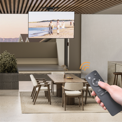 Unrestricted to spaces, PLB-M0748D Large Smart Electric TV Ceiling Mount with Flat and Pitched Ceiling Compatibility & Double Stud Installation Option aims to provide premium coziness for both indoor and outdoor viewing experiences. Via Voice/Tuya App/Remote Control, the TV positions are effortlessly adjusted. Moreover, the mounts can move quietly at a quicker speed with the superior motor and electric push rod. The tilting design provides easy positioning for better viewing, and the foldable design allows the mounts to flip up when not in use. With its compatibility with pitched ceilings and double-stud installation option, PLB-M0748D fits different ceiling structures. After installation, TV’s balance is ensured by levelling adjustments.