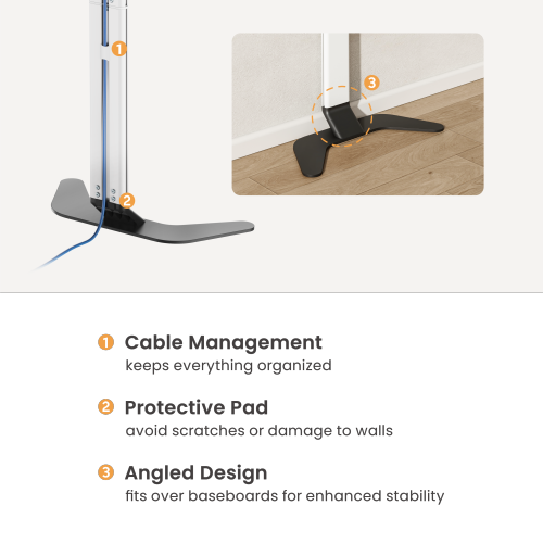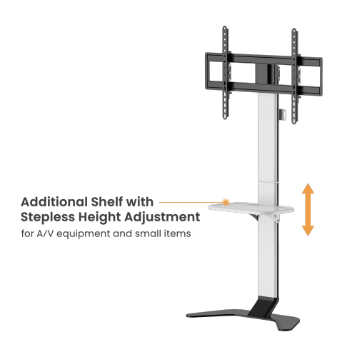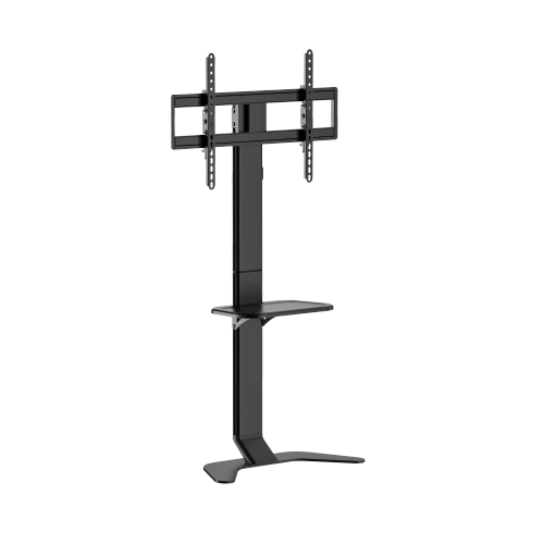 The FS49H-46TD TV Floor Stand is the ideal space-saving solution, featuring a minimalist design that securely leans against any wall. With toolless tilting and adjustable height for personalized viewing, it ensures comfort and convenience. An included safety kit prevents tipping, while the angled design accommodates baseboards for extra stability. Integrated cable management keeps things tidy, and protective pads prevent wall damage. An additional shelf with stepless height adjustment is perfect for A/V equipment. This stand is perfect for modern homes seeking sleek, functional TV solutions.