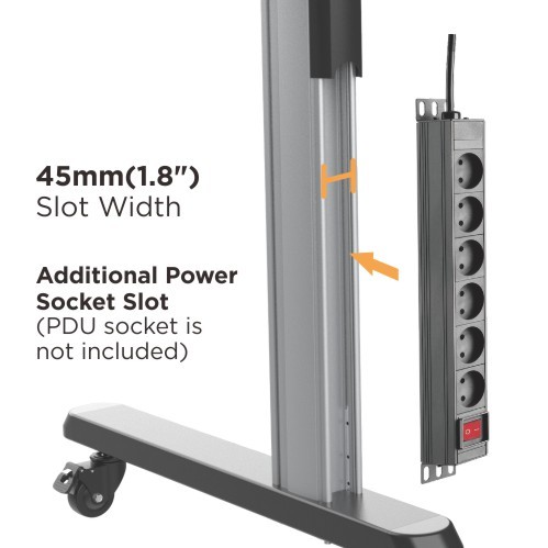 The LES01-36SI Video Wall Cart makes it possible to construct a 6x3/6x4 direct view LED video wall in temporary locations where wall mounting isn't an option. Designed for easy setup, the keyholed mounting plates match Samsung IFH’s mounting mechanism. Industrial grade locking casters allow the cart to move from one location to another. It offers advanced features including cable management and a power socket slot that keeps wiring organized and out of sight.