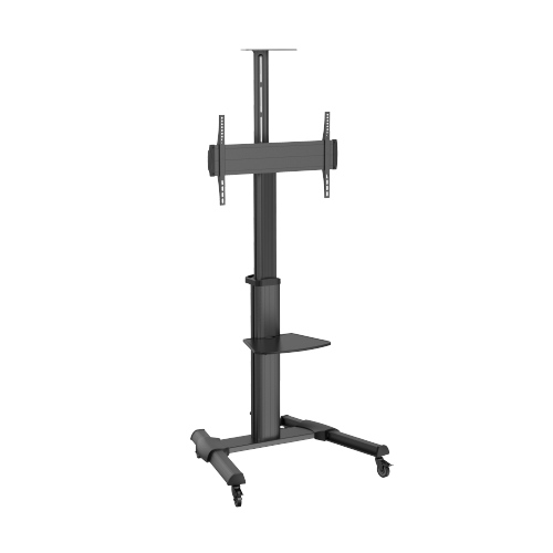 This single display TV cart with stylish, technical and functional design to provide solid presentation solution for most 37''-70'' LED, LCD flat panel TVs up to 50kg/110lbs. The crank handle allows effortless height adjustment of 400mm to match different viewing needs anytime. +5°~-12° freely tilting allows easy angle adjustment and reduces glare from lights or windows to obtain the optimal viewing comfort. Solid base provides additional security by removing the possibility of tripped over and ensures reliable performance for years of use. Ideal for conferencing, public displays or other professional presentation.