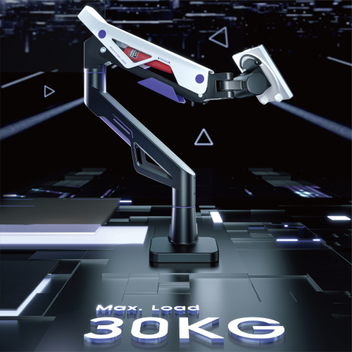 The Heavy-Duty Gaming Monitor Arm is engineered for ultrawide monitors up to 57" and 30kg (66lbs), meeting the rising demand for high-performance gaming setups. Its innovative head structure, featuring a built-in one-way bearing, ensures friction-free tilt adjustments for heavy screens. The futuristic design aligns seamlessly with gaming aesthetics, while the topside installation simplifies the setup process by eliminating the need to work underneath desks. A perfect solution for stable and stylish monitor support in gaming environments.