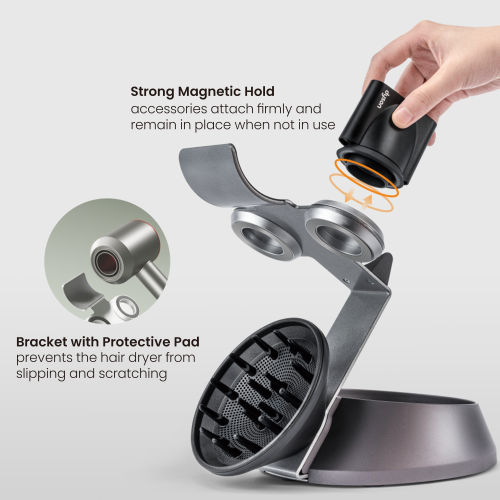 Perfectly hold Dyson Supersonic hair dryer and store the latest 5 attachments with easy access. With a unique silver powder-coated finish, the HAB-10 Hair Dryer Stand perfectly matches any of the Dyson hair dryer color combinations. To help keep things organized a storage container located in the base has space for another accessory or can be used to store the hair dryer’s power cord invisible. Perfect for use in residential bathrooms or even in professional