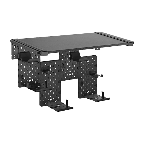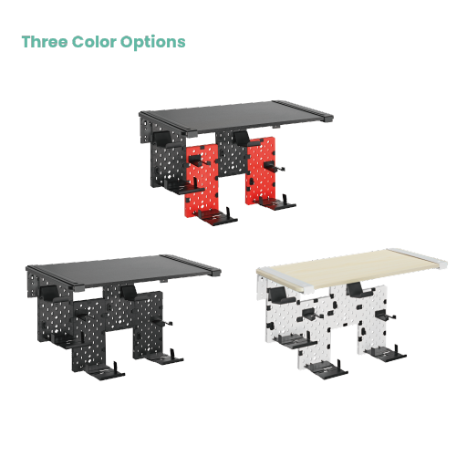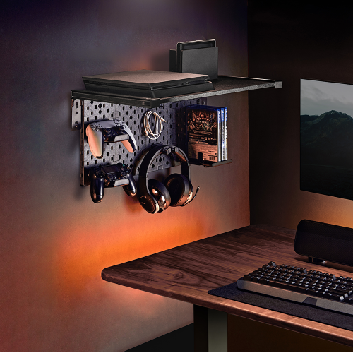 Personalize TV accessories and gaming gadgets display. The spacious media shelf provides ample room for supporting up to 10kg (22lbs) devices. A variety of storage kits are included for storing controllers, headphones, cables, and game discs. Customizable modular design allows the user to freely change the pegboard layout to fit different needs. They come in three color options – meeting the needs for different interior design.