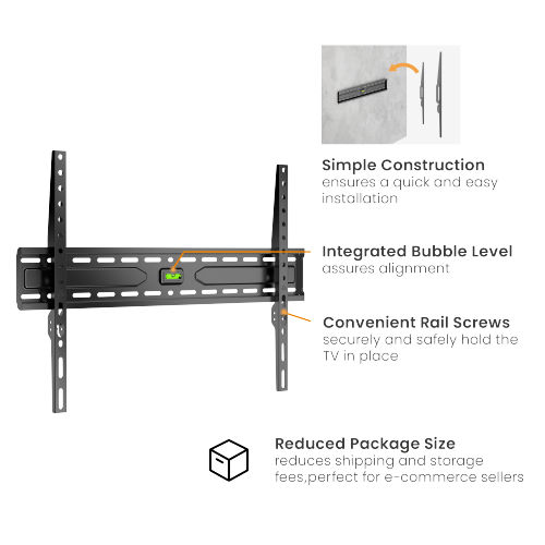 The perfect solution for securely mounting TVs while maximizing the viewing experience. This mount offers stability and durability, ensuring that TVs stay firmly in place. Integrated bubble level assures alignment. Designed for easy installation and compatibility with a wide range of TV sizes, this TV wall mount offers both versatility and value, making it an ideal choice for any home or office setup.