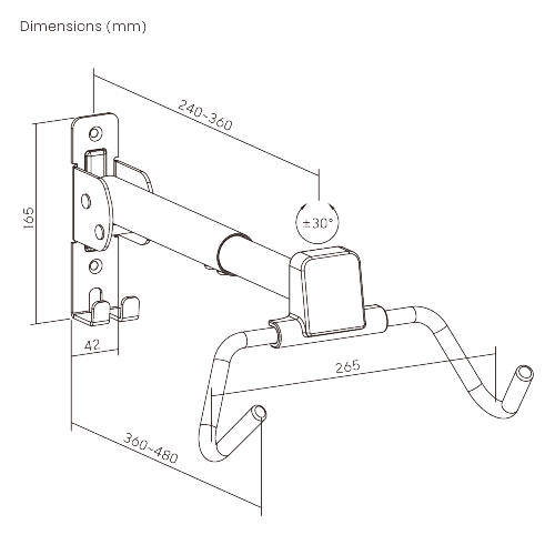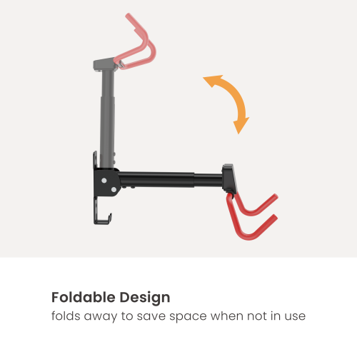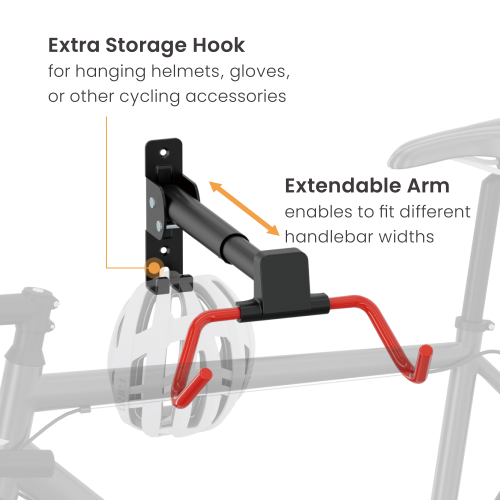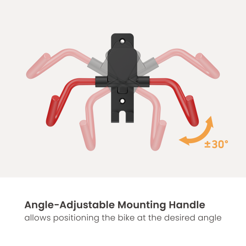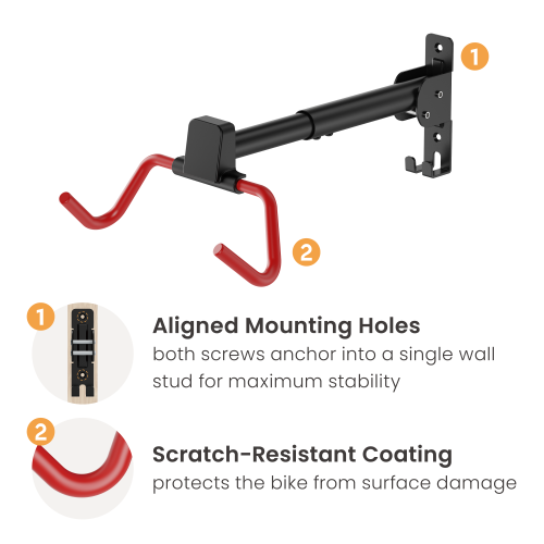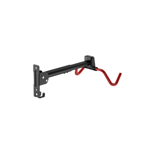 The LBM13-01 Bike Wall Mount features aligned mounting holes that allow both screws to anchor into a single wall stud for maximum stability. The angle-adjustable mounting handle enables flexible positioning, while a secure wheel strap prevents accidental movement or impact. An additional storage hook accommodates helmets or gear, and the foldable design saves space when not in use. This is a durable, space-saving solution designed for streamlined bike storage and everyday convenience.