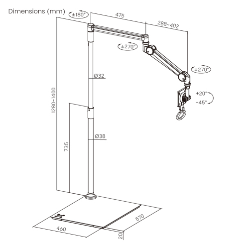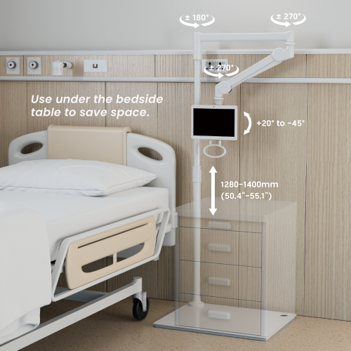 The MED04-4 Height Adjustable Large Base Medical Monitor Floor Stand revolutionized healthcare workspace efficiency. With tool-less full motion adjustments, achieve optimal positioning effortlessly. The arm extension offers diverse viewing angles, enhancing visibility. Its space-saving design allows it to fold flat against the wall and fit conveniently under bedside tables, perfect for compact medical environments. Optimize users’ viewing position with the adjustable height feature. Integrated cable management ensures a tidy setup, reducing clutter.