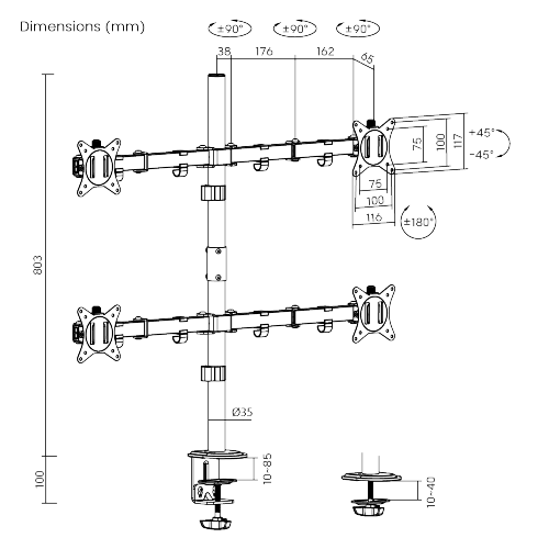 耐久性のあるスチール構造を備えたLDT66-C048は、アームあたり最大9kg(19.8lbs)の17''-32''の4台のモニターを安定してサポートします。十分な調整と視野角を提供する柔軟なデザインは、縦向きまたは横向きのいずれかに調整可能です。ほぼすべての作業面に取り付けるためのグロメットとクランプの取り付けオプションが含まれています。取り外し可能なVESAプレートは、ユーザーフレンドリーなインストールを提供します。整理整頓された職場用のケーブルクリップが含まれています。