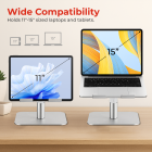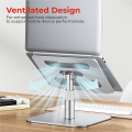 Made of high-quality aluminum alloy, the LPS03-19 Aluminum Laptop Riser features a sleek surface and an elegant appearance. It can securely accommodate most 11”-15” laptops, tablets, and more. Angle, height adjustment, and 360° rotation provide flexibility adjustment for comfortable viewing and optimal working angles. The open area below the upper surface allows for airflow, aiding in heat dissipation, and offers extra storage space for files and other small items. Furthermore, the large sturdy base ensures stability at any height.
