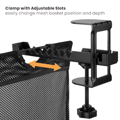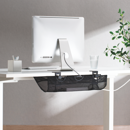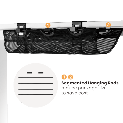 CC11-7は、一般的な昇降デスクのケーブル管理の問題に対する実用的で革新的なソリューションです。軽量でありながら難燃性のメッシュバスケットは、ワイヤーとケーブルを安全に保持し、作業環境をすっきりと整理します。クランプオン設計のおかげで、穴あけは不要で、設置も簡単です。クランプには選択可能なスロットがあるため、ユーザーはメッシュバスケットの位置と深さを簡単に変更できます。付属のケーブルタイは、より整理された外観のために緩いケーブルを固定します。メッシュバスケットの吊り下げロッドは、パッケージサイズを縮小し、輸送と保管のコストを節約するためにセグメントに分割されています。