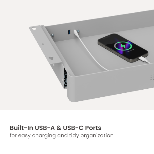 Enhance sit-stand desks with ample storage without compromising legroom. The smooth sliding mechanism ensures quiet operation. Available in black, white, and gray, seamlessly blend with any décor. Include built-in USB-A & USB-C ports for easy charging and tidy organization. Optimized packaging reduces shipping and storage costs.