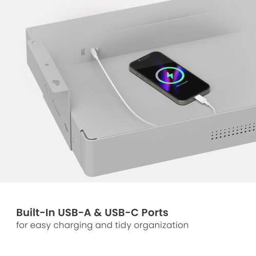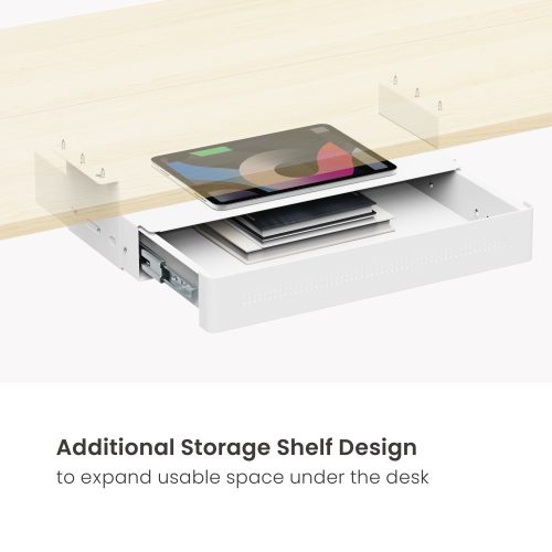 Enhance sit-stand desks with ample storage without compromising legroom. The additional storage shelf design expands usable space under the desk, and the smooth sliding mechanism ensures quiet operation. Available in black, white, and gray, seamlessly blend with any décor. Include built-in USB-A & USB-C ports for easy charging and tidy organization. Optimized packaging reduces shipping and storage costs.