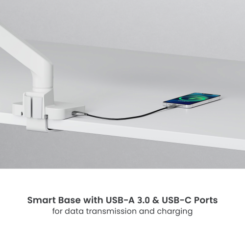A dependable companion for dual-monitor users. Its sliding rail enables the effortless positioning of two screens, while the interactive handle facilitates one-handed adjustment. Featuring a quick-release VESA plate and topside installation base, it offers unparalleled convenience for the best user experience. Moreover, its smart base, equipped with USB-A & USB-C ports, ensures seamless data transmission and charging. Premium leather accents meet sleek functionality, this arm effortlessly complements any interior decor.