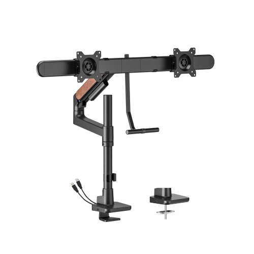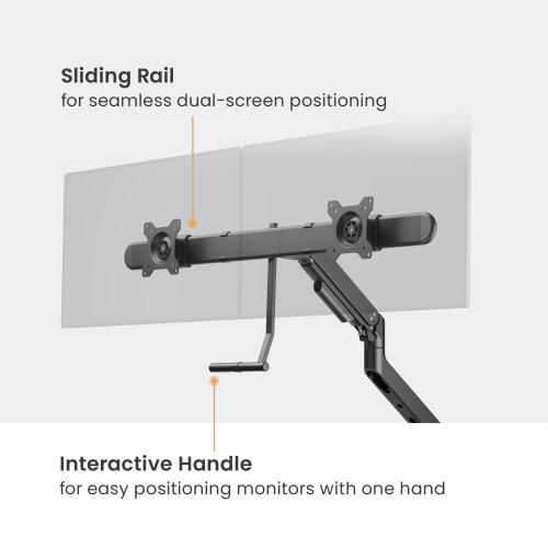 A dependable companion for dual-monitor users. Its sliding rail enables the effortless positioning of two screens, while the interactive handle facilitates one-handed adjustment. Featuring a quick-release VESA plate and topside installation base, it offers unparalleled convenience for the best user experience. Moreover, its smart base, equipped with USB-A & USB-C ports, ensures seamless data transmission and charging. Premium leather accents meet sleek functionality, this arm effortlessly complements any interior decor.