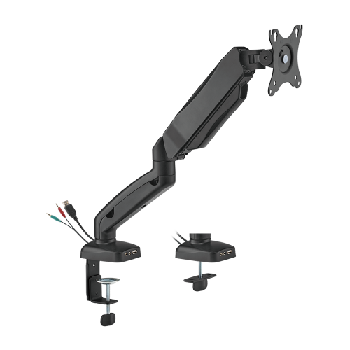 The LDT13-C012UE Monitor Arm provides the user with proper ergonomic viewing with both function and affordability. Perfect for home or office environment with two mounting options- clamp and grommet. Its VESA plate with keyhole slots is designed for quick installation and removal. Quality spring tension mechanism ensures great weight balance for monitors. The quick-release joint allows easy assembly and compact packaging for e-commerce sellers. In addition, a smart base with USB-A and multimedia ports supports data transfer, charging and audio function. The LDT13-C012UE is a good choice to save both time and money while getting the work area more clean and organized!
