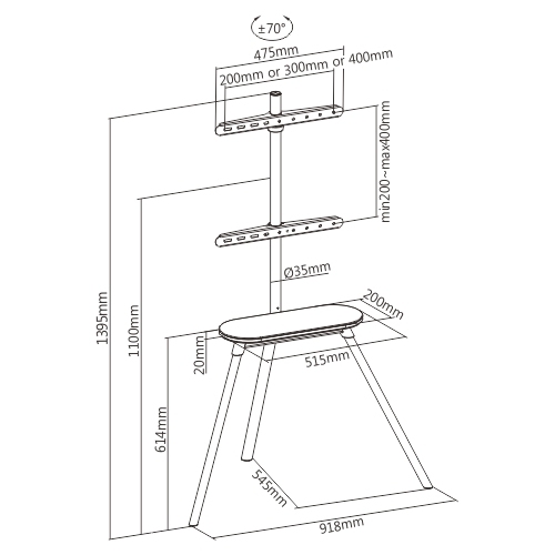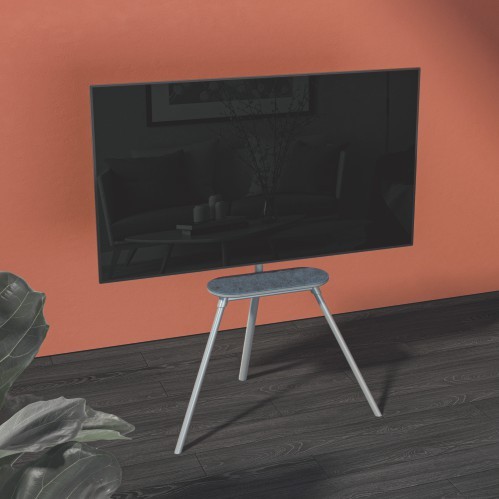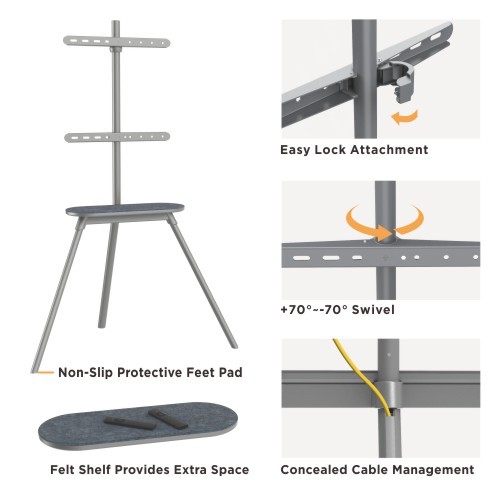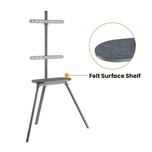 FS28-44F-01 is an Easel Studio TV Floor Stand with a minimalist yet design-oriented style. Designed to create a comfortable viewing environment, ideal for home theaters, offices, display centers, and other uses. The easy lock attachment of arms turns installation a snap, and the +70°~-70° screen swivel allows you to find the right angle for your audience. A soft felt shelf is located directly below the TV that conveniently holds remote controls, portable speakers, and other small items. Cables can be elegantly concealed thanks to the hidden cable management system located inside the leg structure.