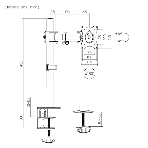 The LDT07-C011 allows you to clear out your desk surface, while providing an ergonomic working position. It is designed to use with 13''-27'' monitors. The weight capability is 8kg/17.6Ibs for each arm. Full motion structure allows maximum flexibility — extends, tilt and swivel your monitor up to 90° left and right for easy viewing. Its ball-joint structure allows smooth, effortless rotating and positioning for any direction, making it easy to reduce glare and find the perfect viewing angle. You can also adjust the monitor vertically to a desired position. Besides, cable clip is included for organizing cables.
