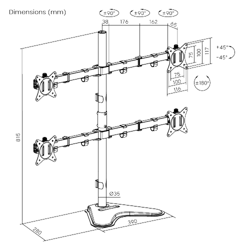 With a durable steel structure, the LDT66-T048 provides stable support for two 17” to 32” monitors up to 9kg(19.8lbs) per arm. Flexible design for ample adjustment and viewing angles, adjustable for either portrait or landscape orientation. The freestanding base provides stability and support on any work surface. A convenient phone slot located on the base. A detachable VESA plate for user-friendly installation. Cable clips included for an organized and clutter-free workplace.