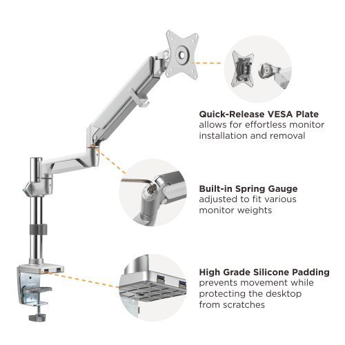 The LDT37-C012UP Epic Gas Spring Monitor Arm moves the user into a new era of viewing comfort and positioning ease. The “Apple-like” aluminum finish pleases the eye while adding a soft yet modern touch to most any décor. The LDT37-C012UP has ability to move monitors with little to no effort and the quality-tested internal gas spring mechanism firmly holds the monitor in place once in position. The LDT37-C012UP Epic monitor arm is the perfect choice for users looking for solid performance and design.