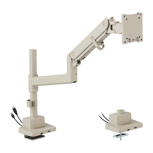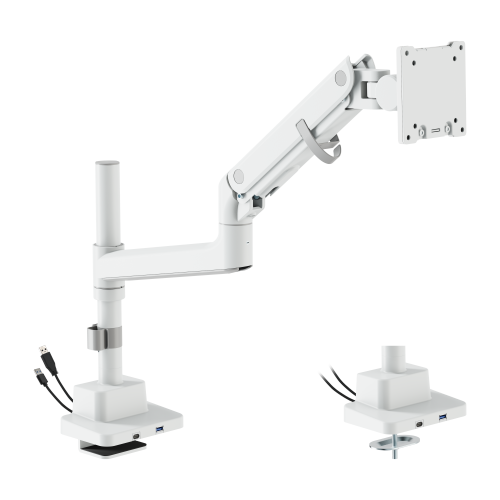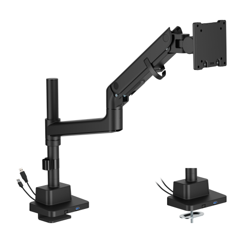 The gas spring mechanism ensures effortless height and tilt adjustments, while the optimized one-way bearing offers smoother tilting. The arm features a quick-release VESA plate for fast installation and integrated cable management for a clean workspace. With topside installation for convenience, the built-in USB-A/C ports provide easy data transfer and device charging.