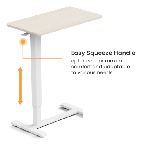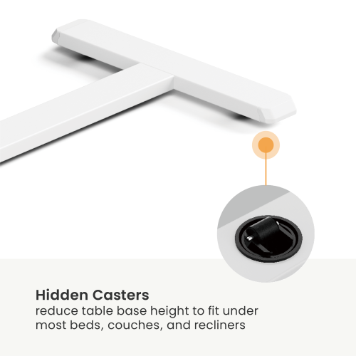 The FMT02-04 combines comfort and versatility. Its Easy Squeeze Handle allows effortless height adjustments, optimizing comfort for various needs. Hidden casters are discreetly designed to reduce the table's base height, enabling it to easily slide under most beds, couches, and recliners. This sleek, adaptable design makes it an ideal addition to any living space.