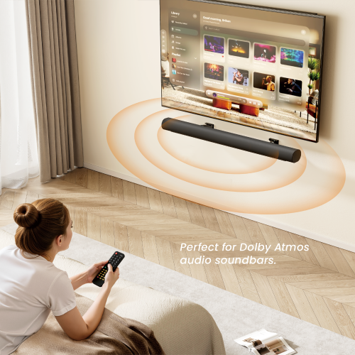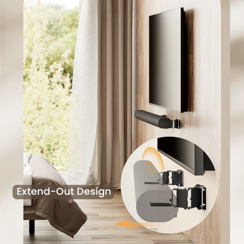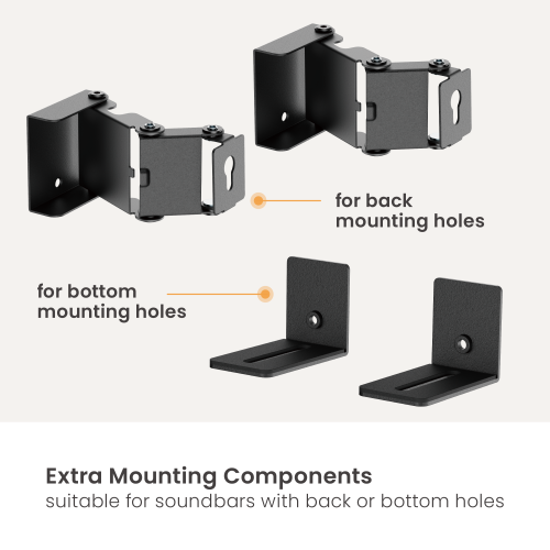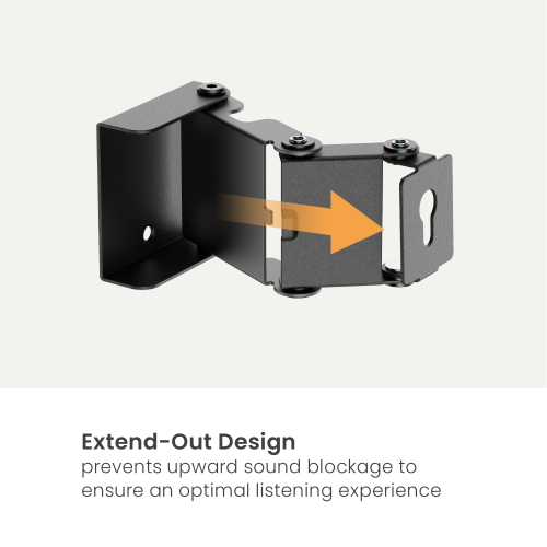 SB-74W provides a soundbar mounting solution that combines flexible adjustment and universal compatibility. Designed for premium audio performance, the SB-74W soundbar mount features a unique extend-out structure that helps your soundbar avoid obstructions from the TV. This ensures that unblocked upward-firing speakers (like Dolby Atmos systems) deliver immersive, distortion-free sound. Besides, the swiveling angle allows users to enjoy sounds at a more precise position. The extra bottom hole mounting parts make this model compatible with soundbars with back or bottom holes.