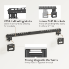 LED21-86 combines ultra-thin design with practical functionality. With a wall clearance of just 9mm (0.35”) and a maximum load capacity of 75kg(165 lbs), it supports TVs up to 100". LED21-86 delivers an excellent user experience through thoughtful features: VESA indicating marks assist in precise bracket placement, lateral shift brackets allow easy left-right adjustment to fit different VESA patterns, and strong magnetic contacts securely hold the TV against the wall. An additional kickstand simplifies cable management and maintenance, while its compact packaging is optimized for e-commerce shipping.