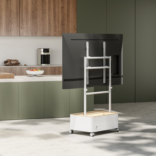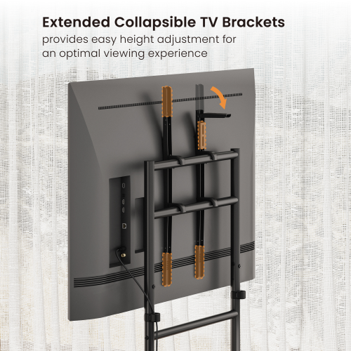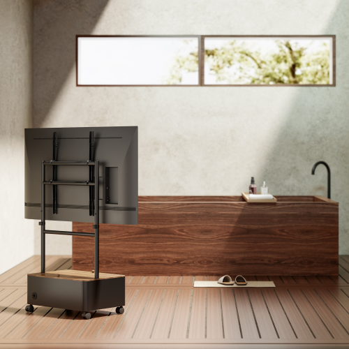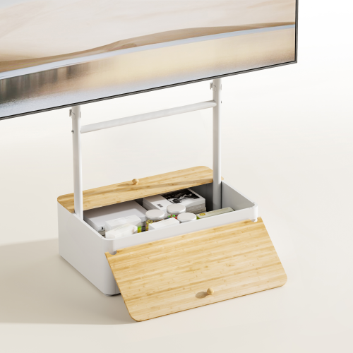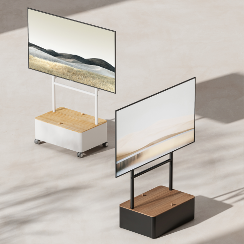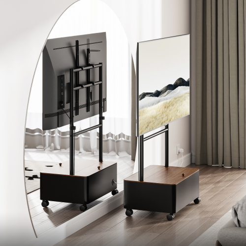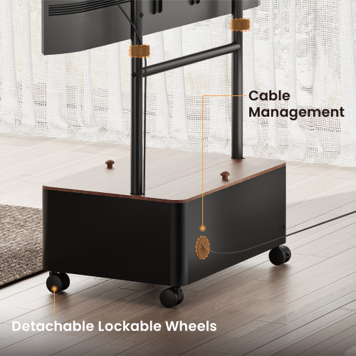 The FS45-44T-01W Easel Studio TV Cart With Storage Box fits 43”-65” televisions, keeping media equipment organized and accessible while adding a sleek, stylish look to the living space. The cart features a generously-sized storage box, making it convenient to store equipment items, snacks, or books. The smooth-rolling caster wheels allow users to relocate their entertainment center to any room effortlessly.