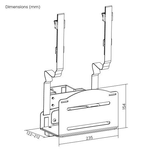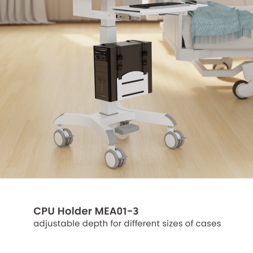 The MEA01-3 CPU Holder is a space-saving solution designed specifically for securely mounting medical CPUs in healthcare environments. Attaching directly to the column of the medical cart helps create a clean, organized workspace that enhances efficiency and workflow. Its adjustable depth accommodates a variety of CPU sizes, while the included safety strap ensures stability and security during movement. Upgrade the facility with the MEA01-3 for a streamlined, professional setup that complements the medical cart and supports seamless operations.