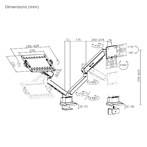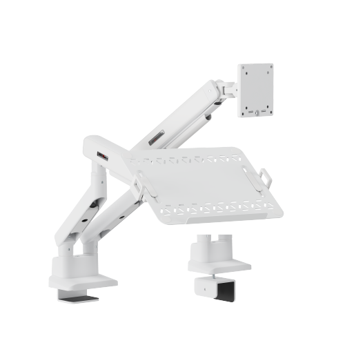 The LDT104-C024ML combines refined aesthetics with robust performance, supporting up to 11kg/24.2lbs. The included laptop holder adds versatility, accommodating laptops up to 9kg (19.8lbs). Designed for users who value both elegance and function, it features a tilt mechanism with built-in one-way bearings for smooth, effortless adjustments. Quick-release VESA plate, joints, and top-mounted installation ensure easy setup and use.