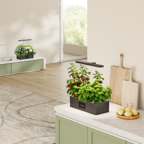 The HGS11-2CD Gardening System offer a modern, compact solution for efficiently cultivating plants in small spaces. With advanced control panel, the systems integrate full-spectrum LED lighting with high PPFD to accelerate plant growth by 3-5 times. A quiet, high-lift water pump circulates water effectively and increases oxygen levels in the nutrient solution to promote healthier root systems. The adjustable light rod adapts to different plant heights, and built-in growing modes support various plant types. With intuitive water level monitoring, durable construction, and a stable stand panel, these systems provide convenience and performance for urban living environments.